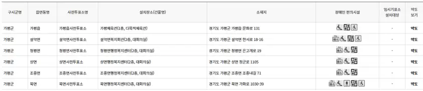 가평군 내 사전투표소는 행정복지센터에 설치되어 있습니다. 예를 들어, 가평체육관(1층, 다목적체육관), 설악면복지회관(2층, 대회의실), 청평면행정복지센터(2층, 대회의실) 등이 있습니다. 자세한 위치는 중앙선거관리위원회 홈페이지에서 확인하실 수 있습니다.