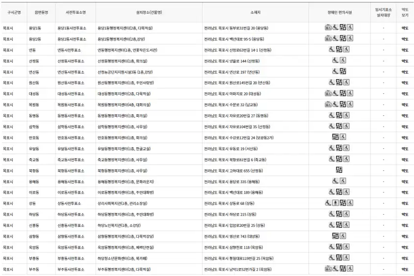 목포시 내 사전투표소는 각 동 행정복지센터 및 문화센터 등에 설치되어 있습니다. 예를 들어, 용당1동 행정복지센터(2층, 다목적실), 부주동 행정복지센터(2층, 다목적실), 대성동행정복지센터(2층, 다목적실) 등이 있습니다. 자세한 위치는 중앙선거관리위원회 홈페이지에서 확인하실 수 있습니다.
