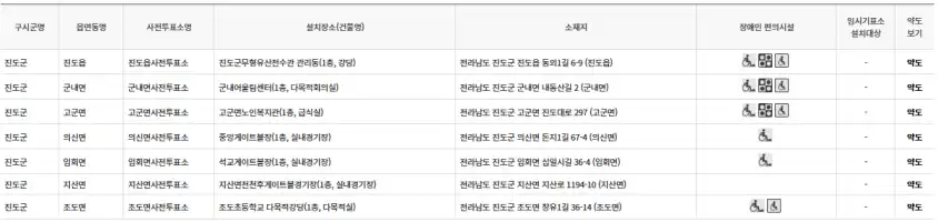 진도군 내 사전투표소는 노인복지관, 게이트볼장 등에 설치되어 있습니다. 예를 들어, 진도군무형유산전수관 관리동(1층, 강당), 고군면노인복지관(1층, 급식실), 중앙게이트볼장(1층, 실내경기장) 등이 있습니다. 자세한 위치는 중앙선거관리위원회 홈페이지에서 확인하실 수 있습니다.